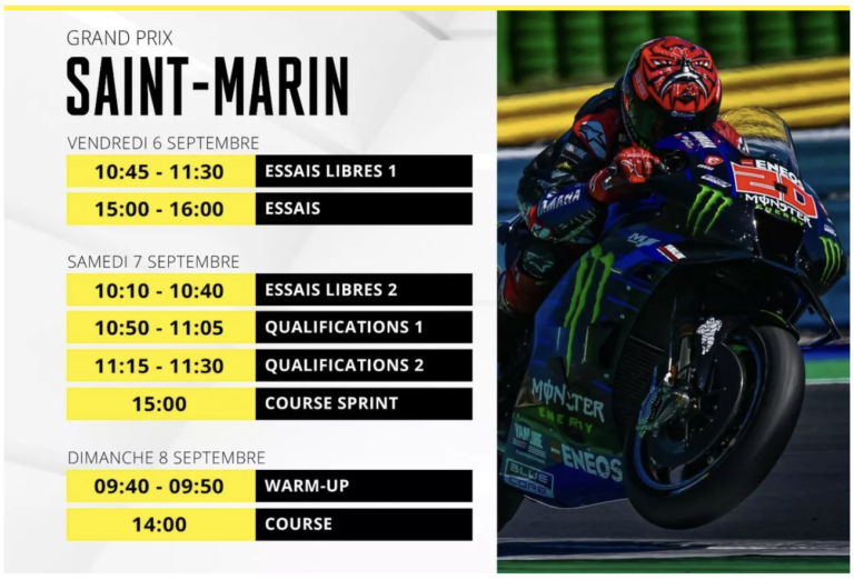 L’été touche à sa fin et, avec lui, le cœur de la saison européenne du MotoGP. Avant d’embarquer pour une très longue tournée outre-mer, le championnat repasse par l’Italie pour deux Grands Prix organisés à Misano. Le premier est le classique GP de Saint-Marin, dont le nom fait la promotion du petit état voisin, avant l’épreuve baptisée GP d’Émilie-Romagne et qui remplacera l’Inde, annulée. Entre les deux, le paddock restera sur place pour un important test officiel lundi 9 septembre.