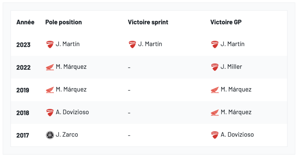 il s’agissait du deuxième succès de Ducati dans l’ère actuelle à Motegi, celui d’Andrea Dovizioso faisant partie des moments d’anthologie de ce Grand Prix, lorsque le pilote italien s’était opposé avec brio à Márquez sous la pluie. Mais l’an dernier, la domination de la marque italienne ne faisait déjà plus aucun doute et c’est Jorge Martín qui avait tout raflé dans une course perturbée par la pluie, tandis que Márquez réussissait l’exploit d’un dernier podium avec Honda.
